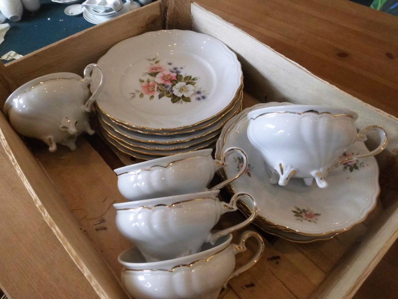 6 Gedecke Chateau mit Füßchen, Dekor Buschwindröschen, dünner Goldrand